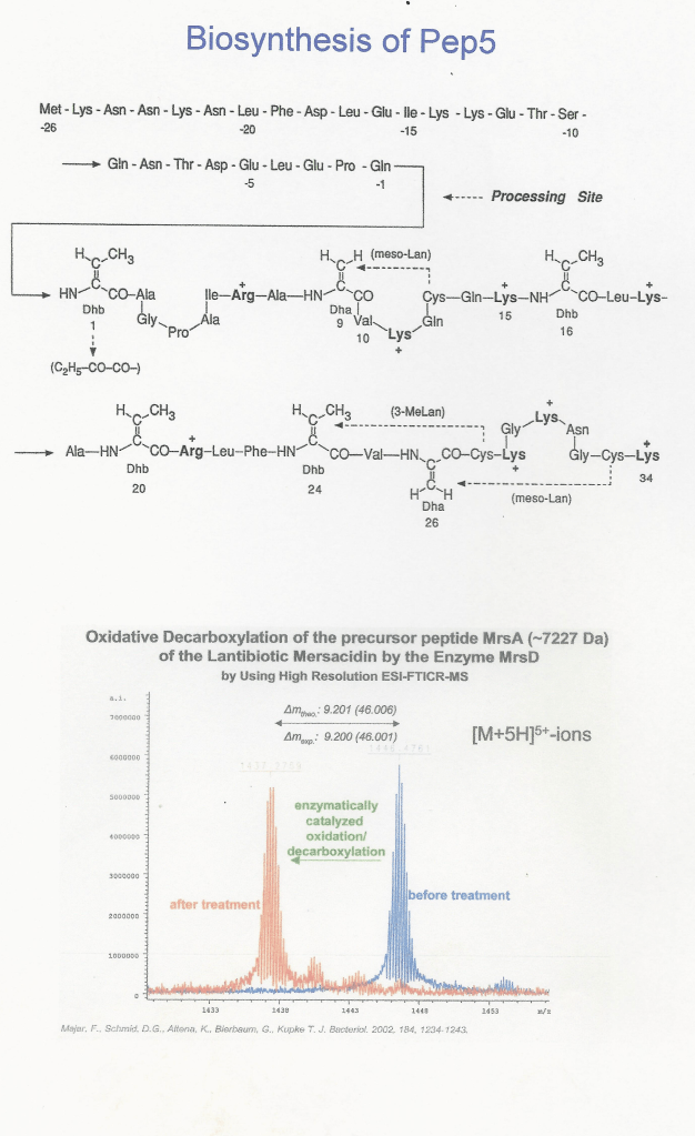 D.G. Schmid, F. Majer, T. Kupke, and G. Jung (2002). Electrospray Ionization Fourier Transform Ion Cyclotron Resonance Mass Spectrometry to Reveal the Substrate Specificity of the Peptidyl-cysteine Decarboxylase EpiD, Rap. Comm. Mass Spectr. 16, 1779-1784.